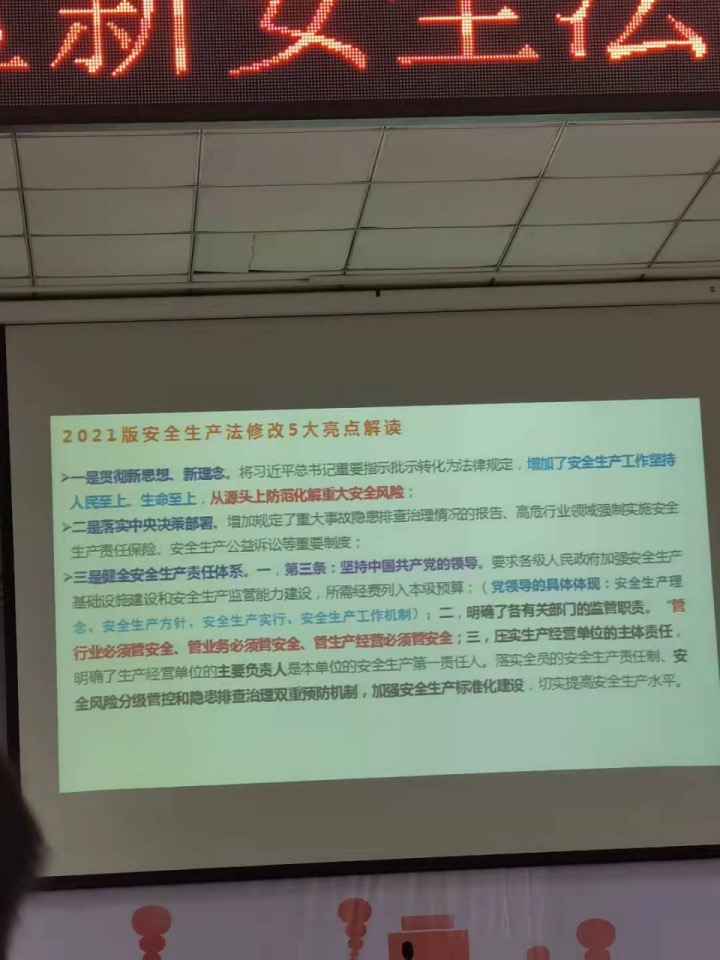 日開展新《安全生產(chǎn)法》知識專題培訓(xùn),進一步宣傳貫徹新《安全生產(chǎn)法》的實施,有效落實安全生產(chǎn)職責(zé),提升安全生產(chǎn)防范意識,有效防范和遏制安全生產(chǎn)事故發(fā)生。